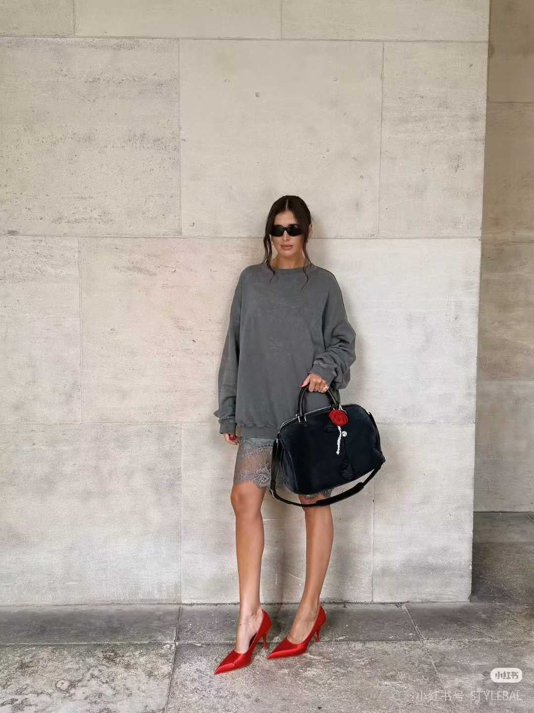 カジュアルなスウェットでありながら、足元にヒールやレザー小物を合わせることで、都会的で女性らしいバランスに。