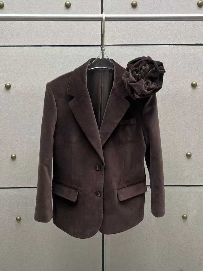 深みのあるブラウンカラーと、ベルベットのような柔らかな表情が印象的なテーラードジャケット。