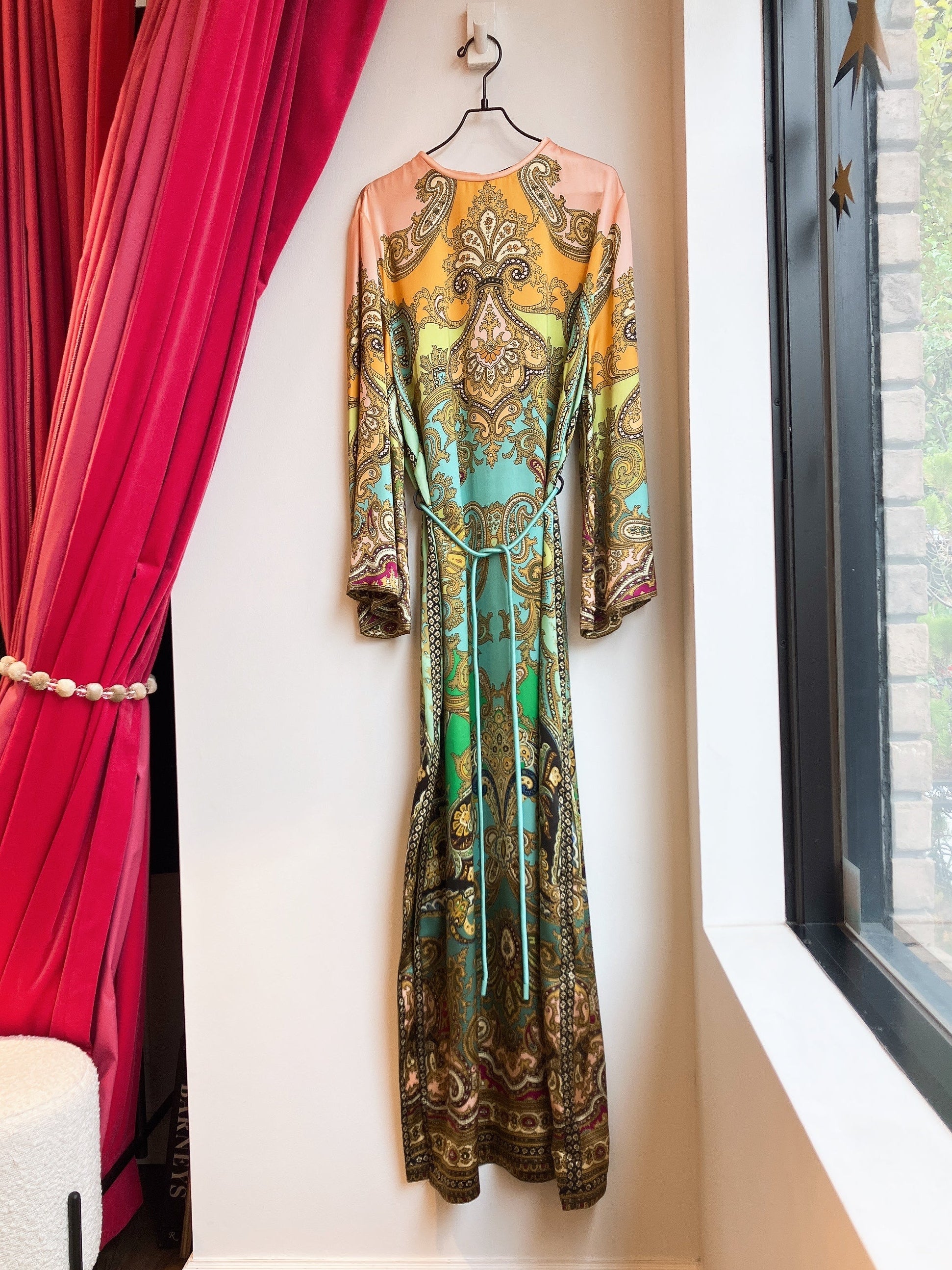 絵画のようなペイズリー模様が全面に施され、ピーチ、ゴールド、ターコイズ、ボルドーといった多彩なカラーが調和した印象的な一着です。
