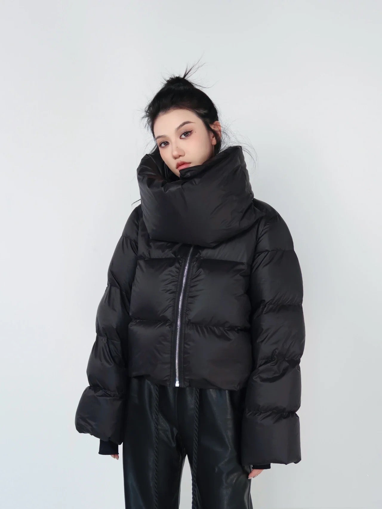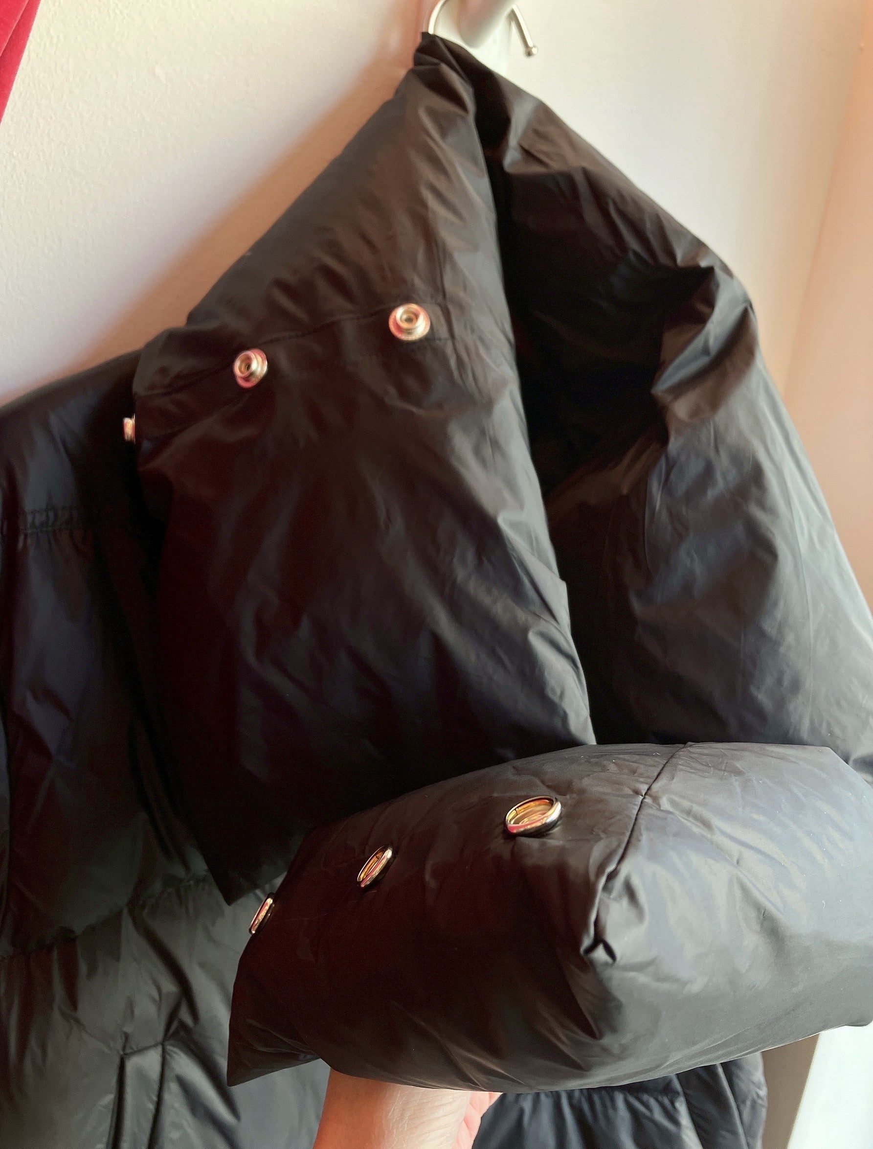 立体的なボリュームスリーブと、顔まわりを包み込む大きなスタンドネックが印象的な、 212BLEECKER LUXE のショートダウンジャケットです。