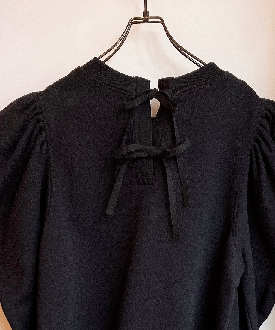 バックネックの2本のリボンと、袖のボリュームシルエットが美しく調和したデザインです。